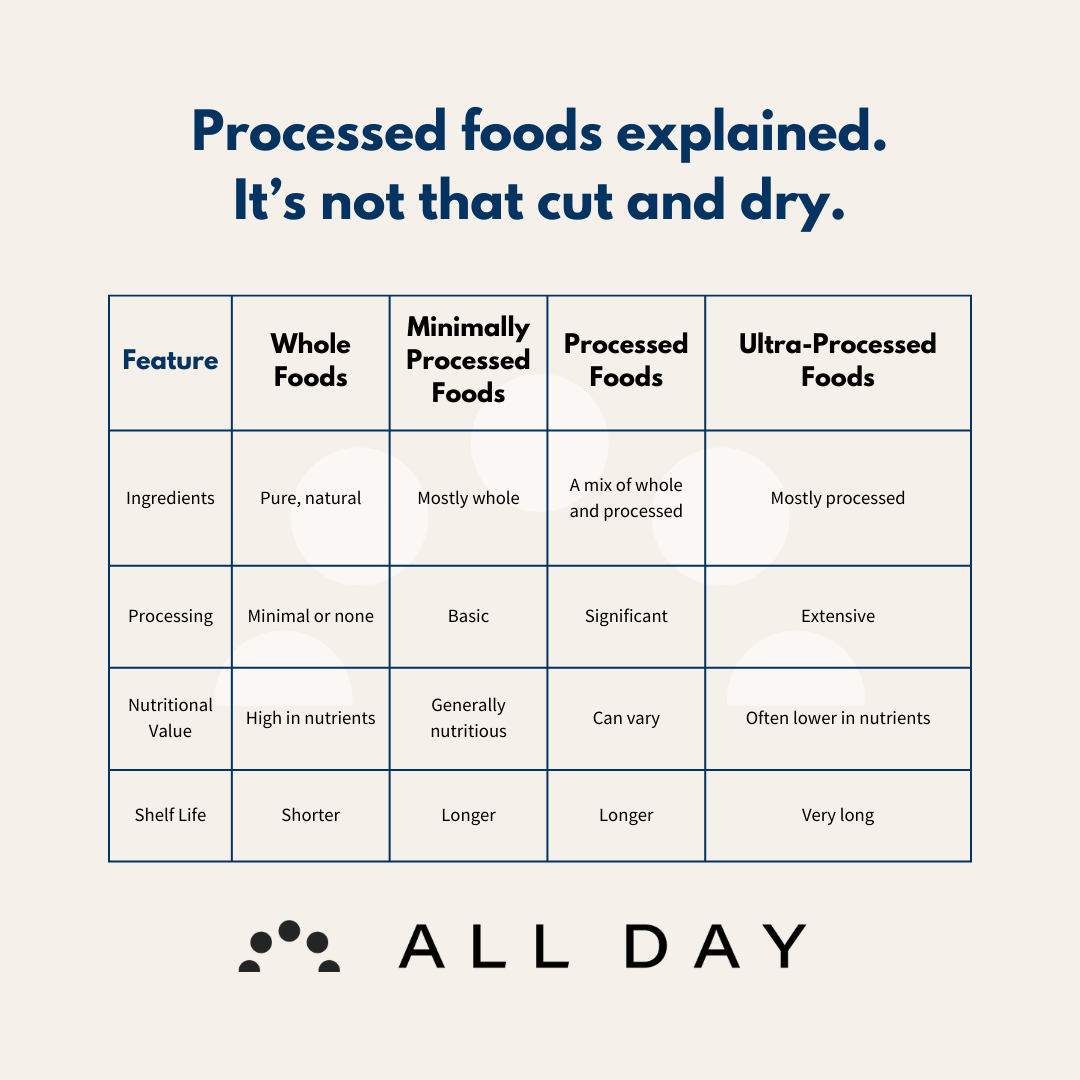 Remember, it's okay to indulge in processed or ultra-processed foods occasionally. Just don't let them become your entire diet. We focus on feeding our gullet with at least 80% whole foods, and enjoy our favorite processed and ultra-processed foods (protein bars and chocolate bavarian donuts) once a week or so. We like to think of them as the fun-sized candy bars of the food world: they're delicious, but they shouldn't be your main source of nutrition.